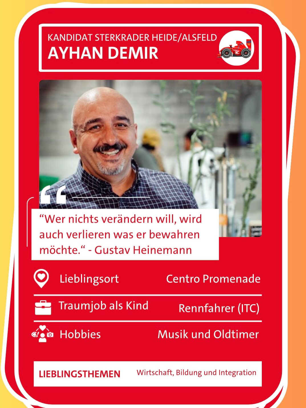 Ich weiß, dass wir nur gemeinsam anpacken können, und gebe alles, um unser Miteinander und unseren Bezirk voranzubringen. Zusammenhalt und Ehrlichkeit sind mein Ziel in der Politik und in Oberhausen Sterkrade-Heide/Alsfeld. Ich stehe für Transparenz und kämpfe hartnäckig gegen Widerstände, die uns von einer solidarischen Zukunft abhalten.